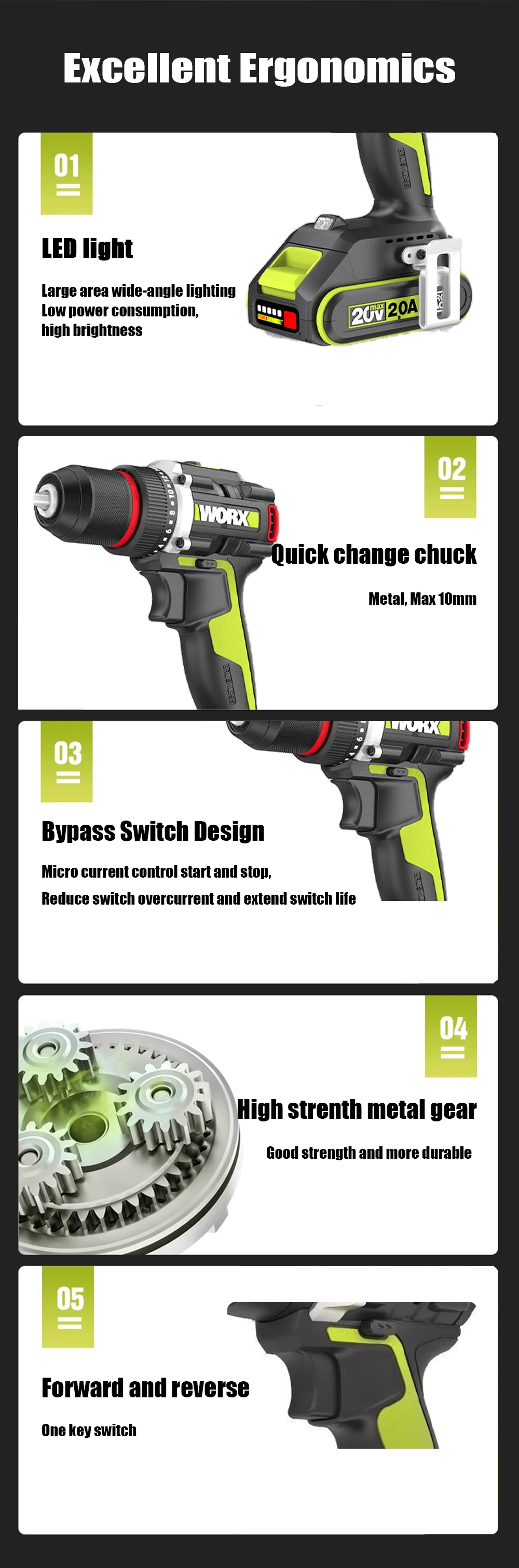 Worx WU173 Wireless Dual Speed Drill Rechargeable Brushless 20v 50Nm 1900rpm 18+1 Torque (Without battery and charger)